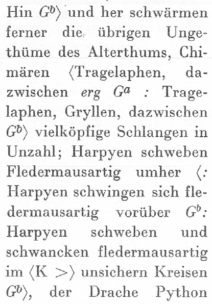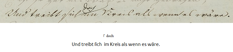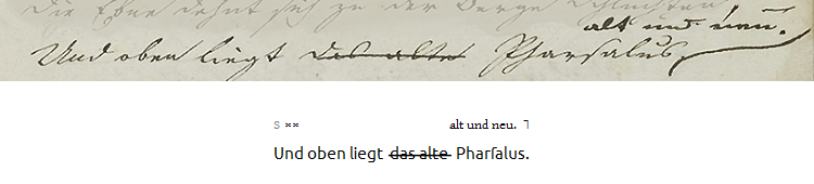 Für die Darstellung innerhandschriftlicher Varianten gibt es in gedruckten Ausgaben eine Vielfalt von Apparatformen. Der in der vorliegenden Ausgabe gewählte Apparattyp hat hingegen nur vorläufigen Charakter. Er beruht auf dem Einblendungsapparat, der für die Akademie-Ausgabe der Werke Goethes entwickelt wurde (Abb. 5).